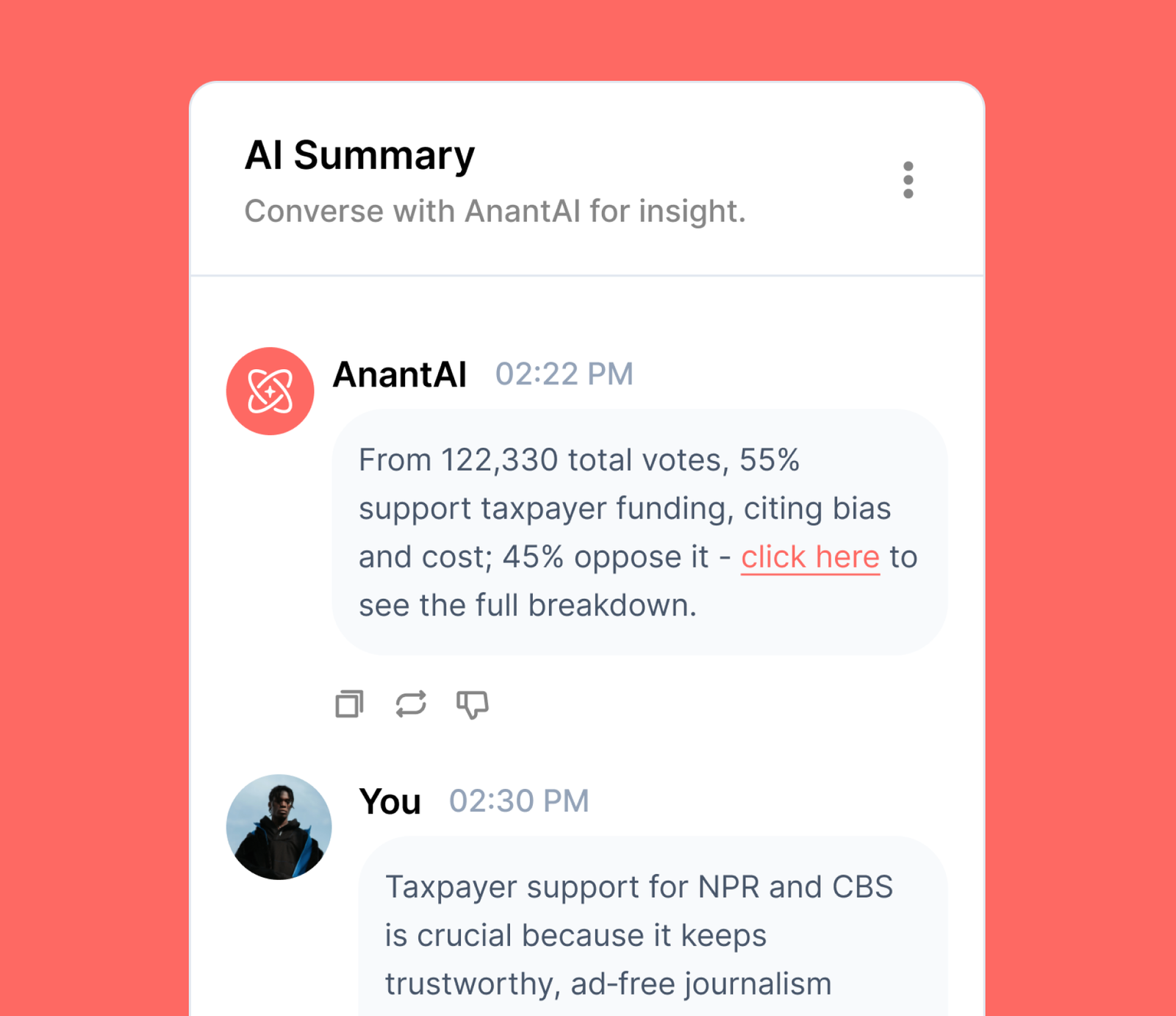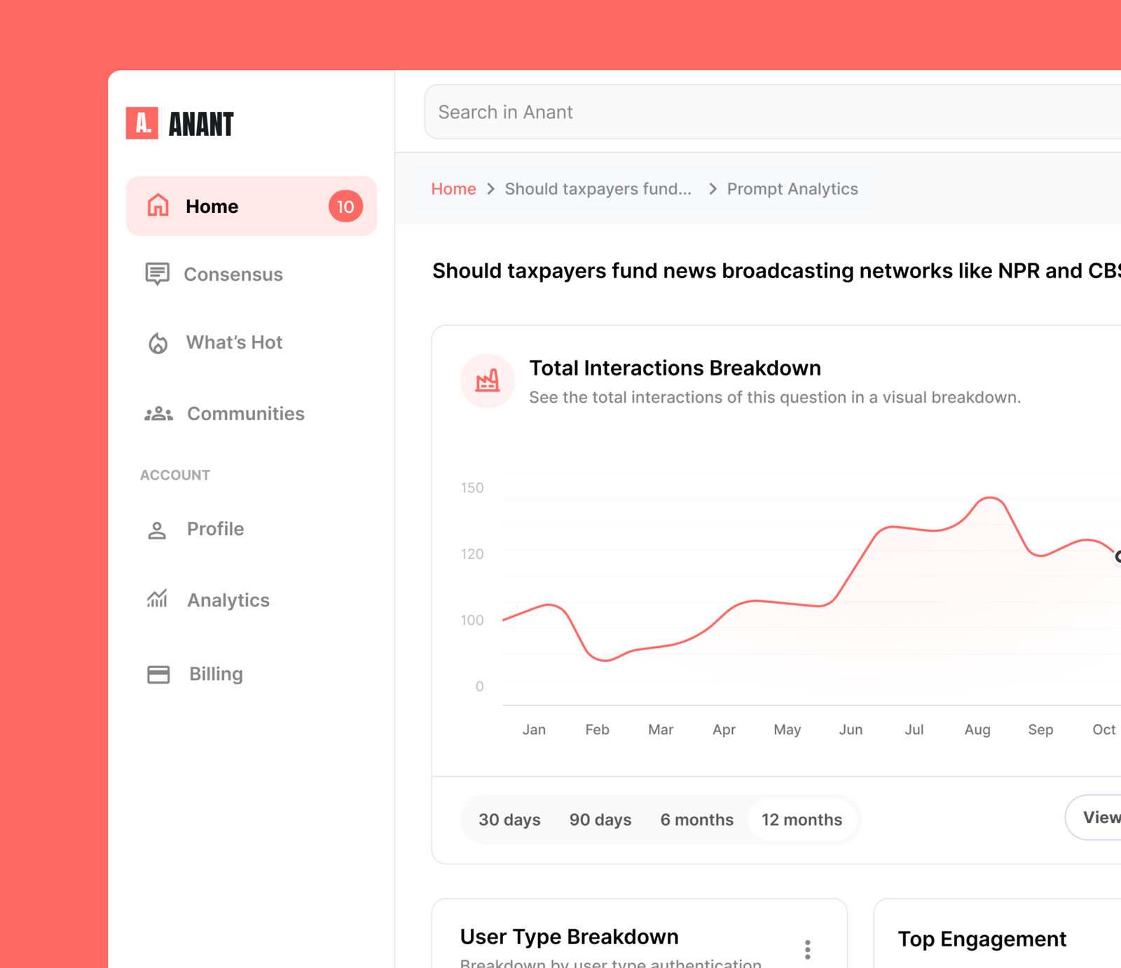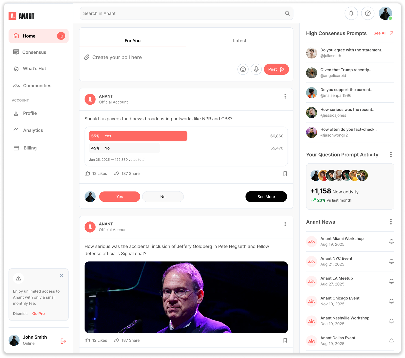 Yes, Anant encourages community-driven content! As an active participant, you’ll have the opportunity to submit questions and prompts, contributing to the platform’s growing database of public sentiment. All user-submitted prompts are reviewed to maintain quality and relevance, ensuring that the platform remains a trusted source for capturing genuine public opinion. Additionally, users who post high-consensus prompts may receive special recognition or rewards, highlighting their contributions to shared understanding on key issues.