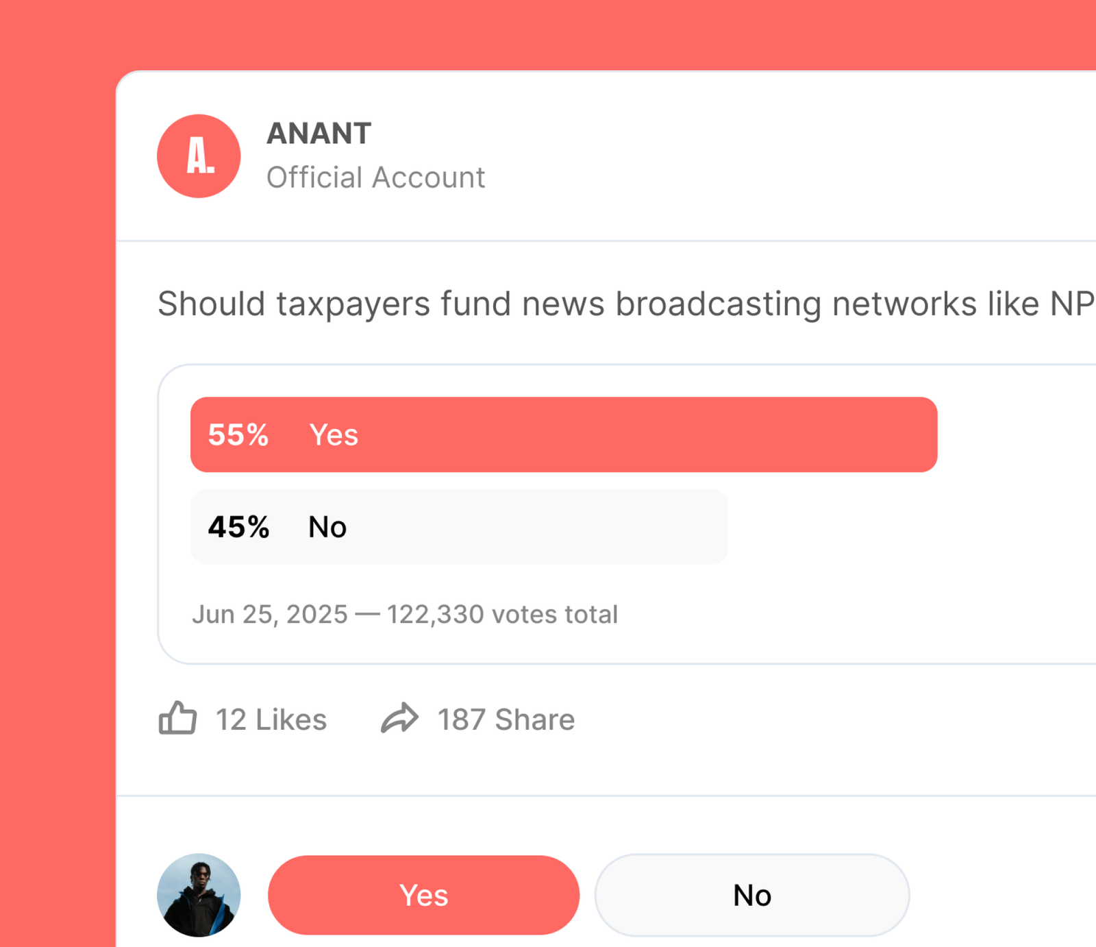 The more you engage with Anant, the deeper the insights you unlock. Starting with general public sentiment, each level of engagement reveals new perspectives, such as demographic breakdowns by age, location, and profession. As you reach higher levels, you’ll gain access to premium insights, like trend tracking and cross-demographic comparisons, giving you a comprehensive view of how various groups align on key issues.